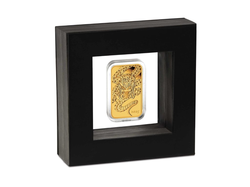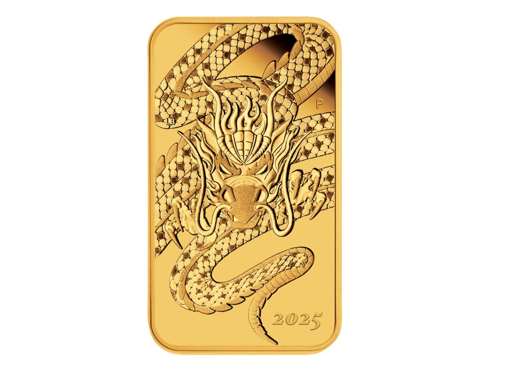 Drak je po staletí v čínské kultuře uctíván jako symbol moci, štěstí a bohatství. Tuto výjimečnou minci ve tvaru zlatého slitku razí renomovaná australská Perth Mint od roku 2018. Má nominální hodnotu 100 AUD. Motiv draka se na rubové straně každoročně mění.