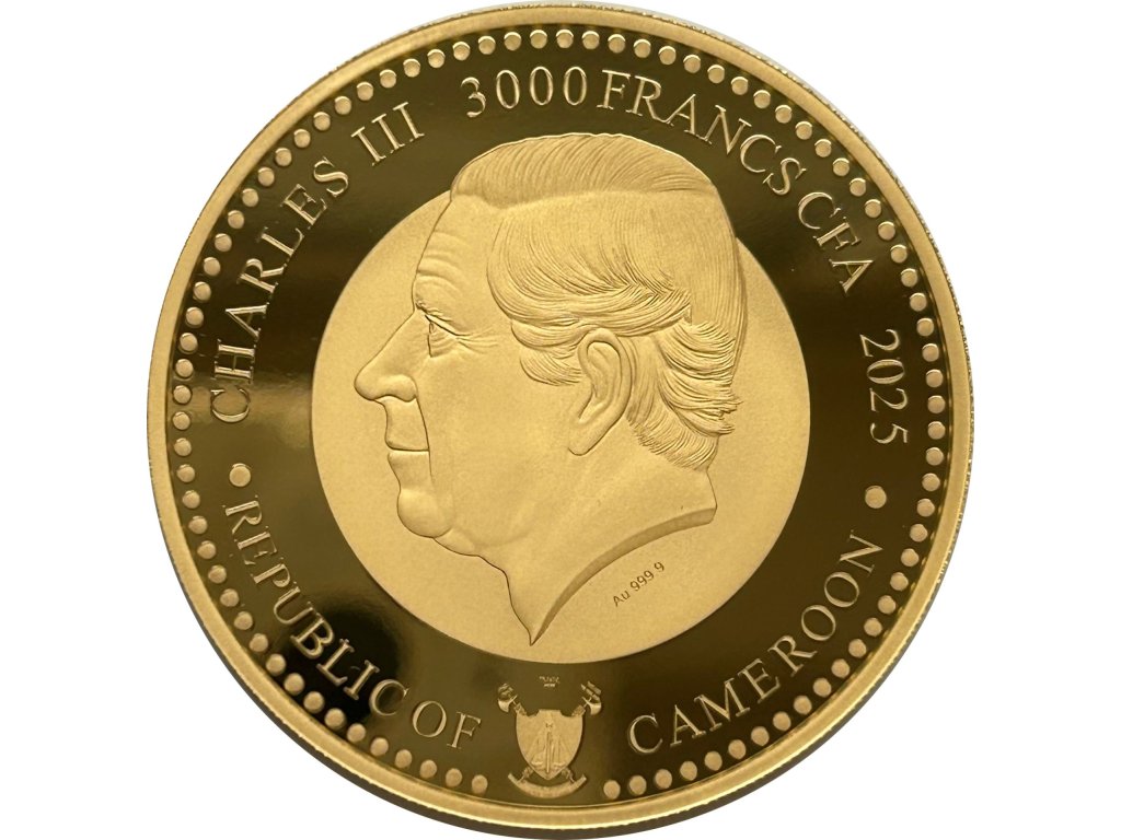 Lícová strana zobrazuje portrét krále Charlese III. Pod touto podobiznou je erb vydávající země Kamerunu a nápisy "Republic of Cameroon", "Charles III", nominální hodnota "3000 Francs CFA" a rok vydání "2025".