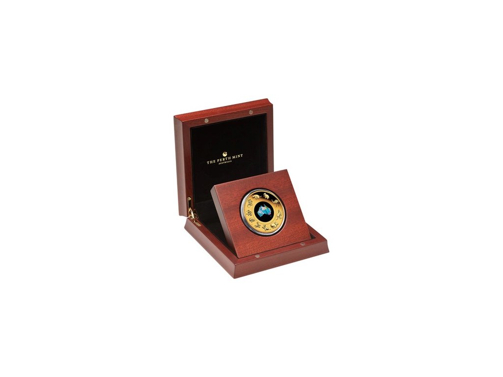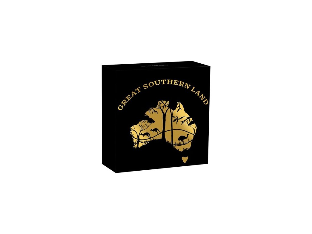Tato výjimečná zlatá mince z australské Perth Mint obsahuje vložený opál ve tvaru Great Southern Land, jak se dříve také říkalo Austrálii je ražena z ryzího zlata ryzosti 999,9/1000 a v nejvyšší ražební kvalitě PROOF. Opál je barevný drahokam, který je ve své nejcennější podobě známý nádhernou hrou barev.