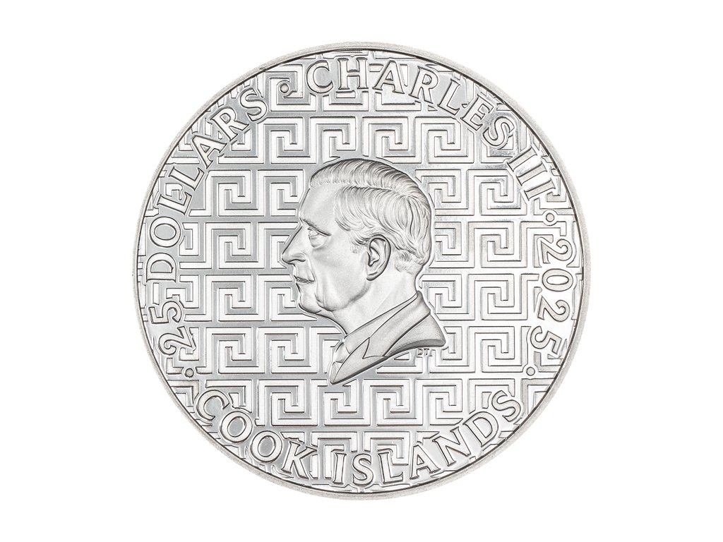 Na hodnotové straně mince je portrét krále Charlese III, včetně vydávající země "COOK ISLANDS", nominální hodnoty „25 Dollars“ a rok vydání „2025“.