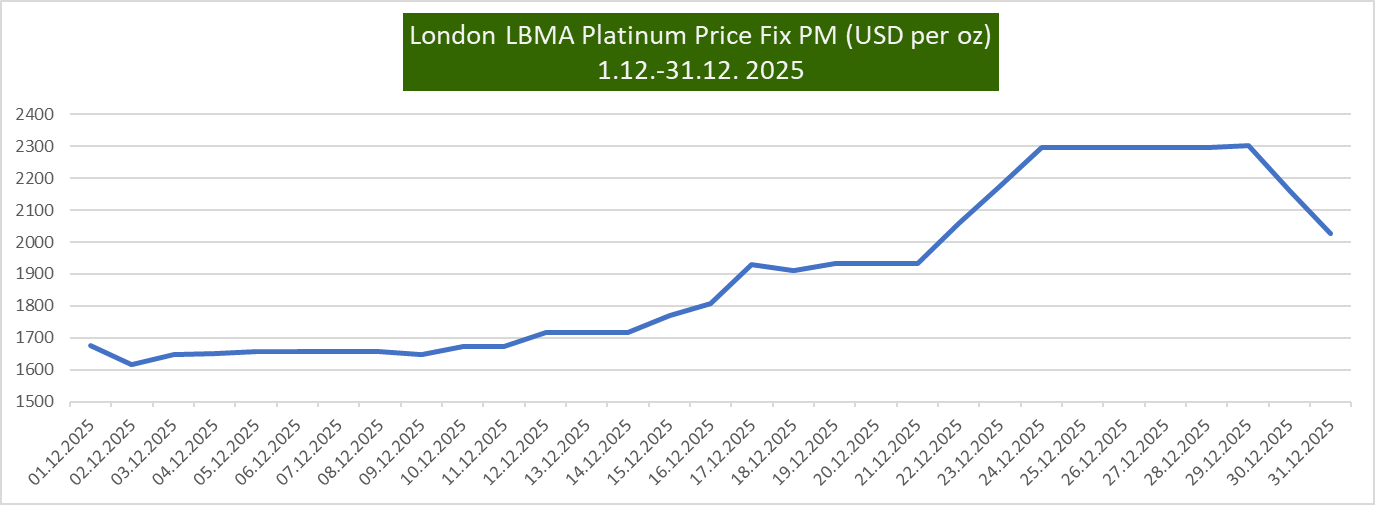 Tento graf zobrazuje vývoj ceny platiny za trojskou unci (1 oz) v průběhu 1.12. - 31.12. 2025