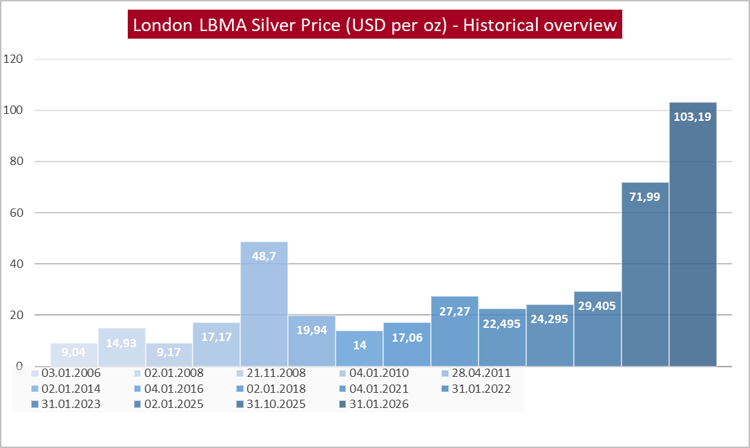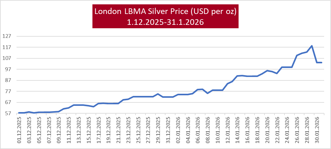 Tento graf zobrazuje vývoj ceny stříbra za trojskou unci (1 oz) v průběhu 1.12. - 31.1. 2026