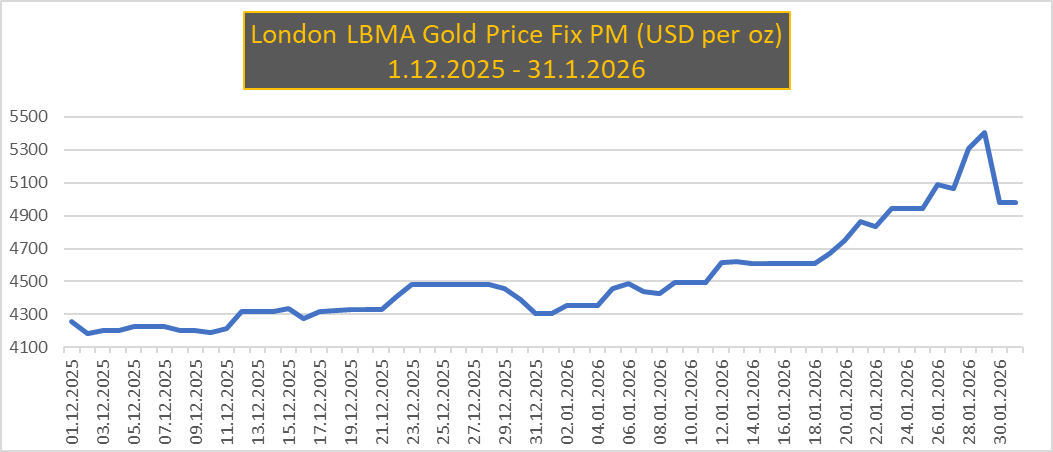 Tento graf zobrazuje vývoj ceny zlata za trojskou unci (1 oz) v průběhu 1.12.2025 - 31.1.2026